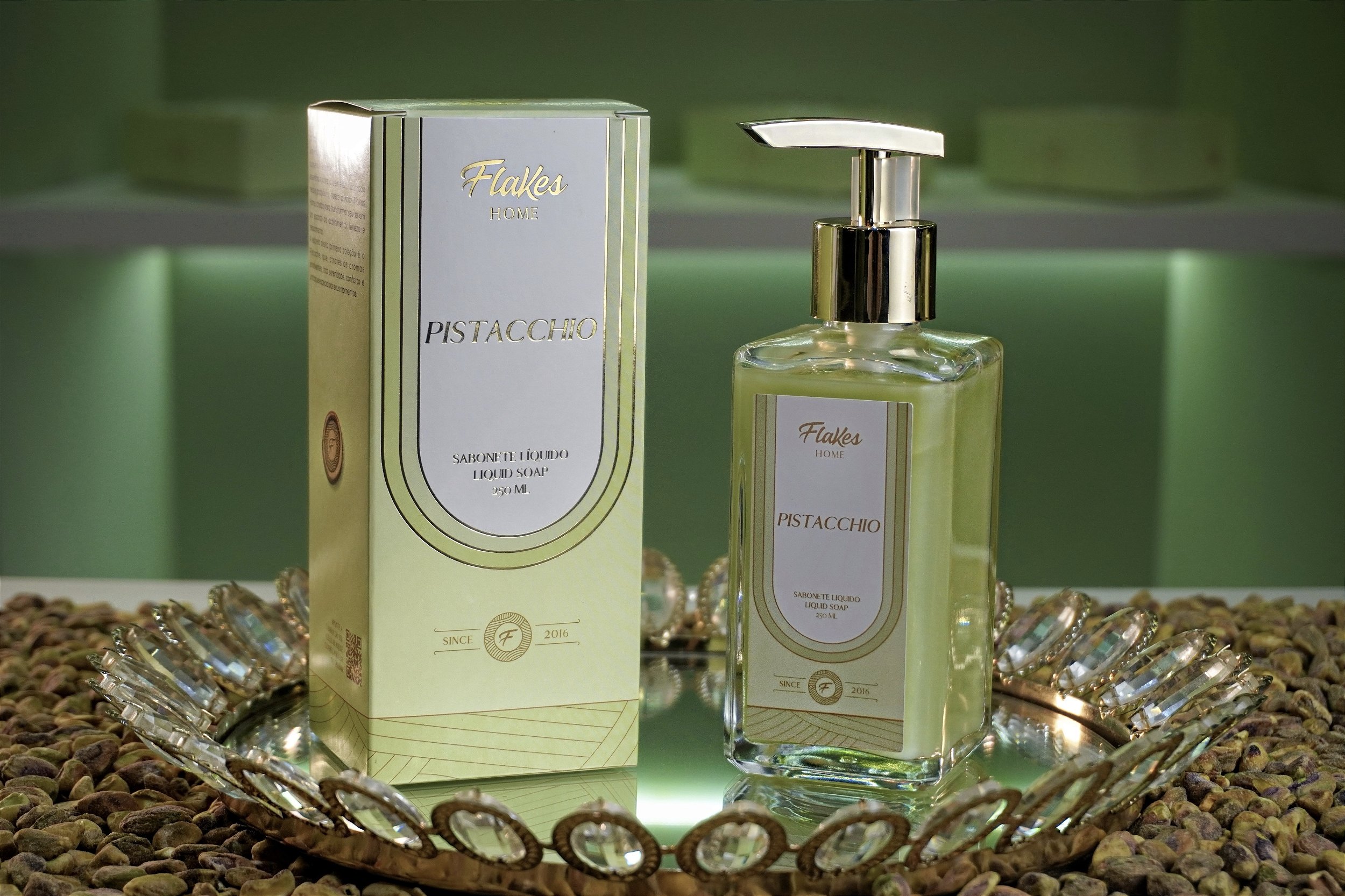 Sabonete líquido Pistacchio garantindo limpeza e hidratação para suas mãos, com Aloe Vera e Glicerina.